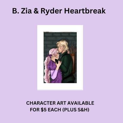 What's included: signed paperback, 1 piece of character art (shown), and a bookmark (shown)